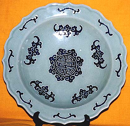 豆青釉青花加白五蝠捧壽文八菱盤(清後期時代、AD1851〜1874) |