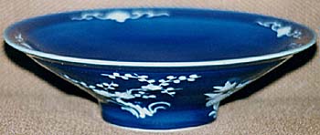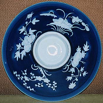 高さ7.5cm、口径25.7cm、底径9cm 民窯作品であっても可成りの上手ものである。深くて鮮 やかな藍釉地の上に、加白され透明釉がかけられてい る。口縁部分は天地左右に梅花紋、見込みに一対の 蝙蝠紋、外面に四季花(梅・牡丹・蓮・菊)紋が、それぞ れ加白され、深藍色の中に浮き上がって来る加白紋様 は、引き締まった凄烈さを感じさせる。道光時代の民窯 作品であろうと推測させるが、見込みの蝙蝠の形及び 全体の形状からすれば、清後期(同治・光緒)時代に下 がる可能性も無いわけではない。上段が裏面から、下 段が側面からの画像である。 |
