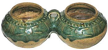 高さ7.7cm、横幅12.8cm、口径6.9cm、腹径10.8cm、底径7.4cm 可成り青みを帯びた透明度の高い緑釉で、むしろ青緑釉と称 した方が良い。この形態の雙連壺は、既に古く新石器時代か ら連綿として作られており、現在の山西地方でも焼かれてい るが、具体的使用目的は良く分からない。形態は連結部分の 執手が横向きか縦向きかの違いが有る程度で、歴代大きな 相違は認められない。本品は、色調・台土等から、清朝末期 のものと考えられる。 |