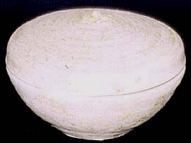 総高6.5cm、蓋高3cm、口径11cm、底径5cm やや薄灰色的の胎土で、焼けこげや出土物として の変色も認められるが、焼き締まった細かい肌理 の灰陶である。蔕形の紐が付けられた蓋には、う っすらと六重の弦紋の跡が窺え、底部には轆轤の 糸切りの片流れの紋様がはっきりと見られる。本来 は蓋に青磁が施して有るのが一般的であるが、本 品は施釉忘れの為に捨てておかれた物であろう。紋 様や蓋の形態・碗の立ち上がり角度等から、三国時 期の青磁ものと判断したが、或いは東晉頃まで降っ た長沙窯の可能性も有る。 |