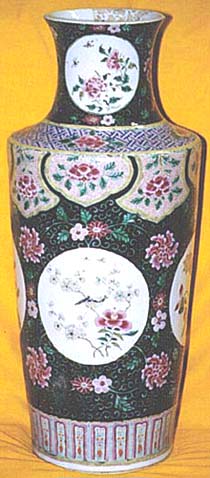黒地粉彩開光花鳥文瓶(清末期時代、AD1875〜1911)