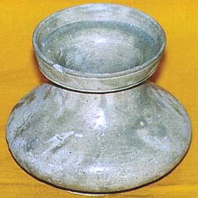 や欠けなどが見られるが、青磁釉の唾壺で、平