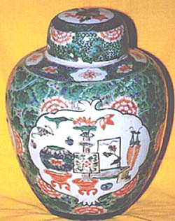 五彩開光博古文有蓋罐(康煕年間、AD1662〜1722) |