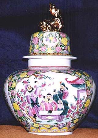 景徳鎭粉彩開光花鳥文桃園結義圖有蓋將軍罐(現代、AD1990〜1999)