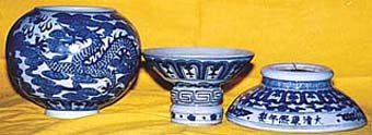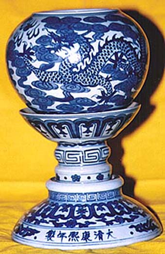 総高23.5cm、球高12.5cm、球口径7.2cm、 球底径6.1cm、中座高8.1cm、中座口径12.7cm、 中座底径5.6cm、台座高5.3cm、台座口径8.3cm、 台座底径15.8cm、在銘、大清康煕年製 実に不思議なものである。台座付き碗は已に明の弘 治年間から「座付浄水碗」として出現するが、本品は、 上の球形も中間の中座も筒抜けで、水など入れたら漏 れてしまうし、球の口径も手を入れるには小さ過る。亦 た清朝に見られる「冠架」にしては、中間の中座の高さ が低すぎる。しかし、座付浄水碗としての使用が不可 能である以上、例え高さは低くても一応冠架と見るべ きであろう。青花の色調も、下部の台座は清朝末の釉 調を示し、中座は民国時代の色調で、上部の球形は 民国初期の紋様と言う具合で、本来のものが破損した ため、各パーツを集めて復元したように見受けられる。 |
