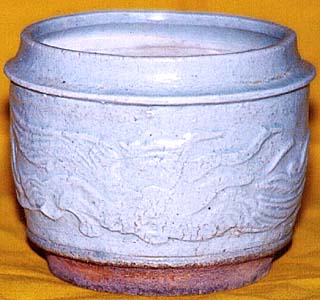 胴体に二匹の鳳凰が浮き彫りで施されている。青白磁の色