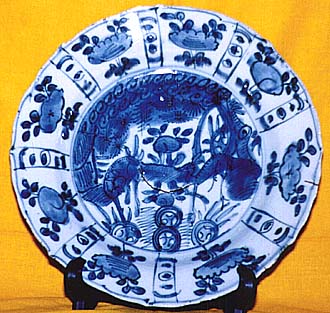外銷瓷青花八開光松木雙鹿文盤(萬暦年間、AD1573〜1620)