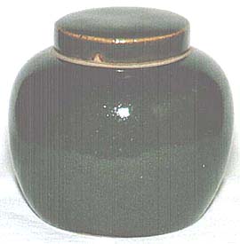 高さ7.8cm、口径4.2cm、腹径8.8cm、底径6.3cm ゼンギョとは田鰻のことで、田鰻のくすんだ苔むしたような 暗濃緑色の単色釉薬を、ゼンギョ緑釉と称している。ゼン ギョ緑釉もそうであるが、茶葉抹釉など同系統の緑釉の清 朝ものは、磁土で本体を形成するのではなく、軟らかい陶 土つまり陶胎で形成して、その上に釉薬が施されるのが一 般的であり、民国以後の新しい物になると磁胎で形成され ている。本品は、磁胎ではないが、完全な陶胎でもなく、や や堅めの陶胎つまり半陶半磁の胎土であれば、清朝後期 頃のゼン魚緑釉の茶葉罐であると思われる。 |