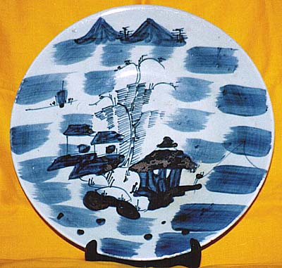 豆青釉青花山水家屋文皿(同治年間、AD1862〜1874)