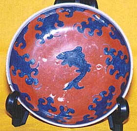 紅釉地青花魚文皿(明末期時代、AD1621〜1661) |