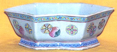 金彩をのせた清末民窯の雙連(変形六菱)鉢である。この様な横長