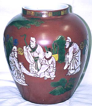 高さ24.4cm、口径12.2cm、肩径21.4cm、 底径11.7cm、在銘、大清康煕年製(青花款) 紅地の上に白色の粉彩で八仙人と四人の唐子を描 き、その間に緑彩で石や花木があしらわれている。 高台は無釉の平高台であるが、銘文の所だけ一段 落として釉薬を施し青花の銘が書かれている。巻き 上げ形式の造型で肩継ぎである。民國時代の雑器 と思われるが、紅釉の色調が、何となく民國以後の 可能性を窺わせる。 |