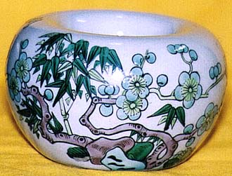 やや灰色っぽい白地の上に三彩で松竹梅が描かれている。銘