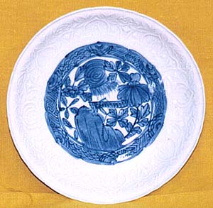 高さ2.9cm、口径15.6cm、底径8.7cm 見込に青花で花卉と昆虫の紋様を描き、その周囲の内側面は、 白釉で凸(陽)刻の桃紋様が一周している輪花皿であり、高台内 には、うっすらと飛びかんなの痕が窺える、なかなかの上手もので あるが、現代の倣清品である。確かに清朝には、青花白釉凸刻文 皿が存在するが、紋様・色調・厚みなどが異なり、特に口縁の立ち 上がりはいかがわしく、高台内の飛びかんな痕も、わざとらしい。 |