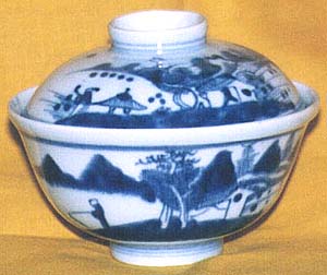 碗にも蓋にも、青花で山水と釣魚の紋様が、描かれて