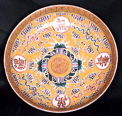 黄地粉彩萬壽無疆文盤(光緒時代、AD1875〜1908)