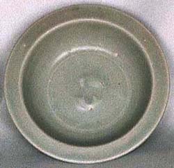 高さ3.3cm、口径12.6cm、底径6.4cm やや黄緑がかった青磁で、釉薬は薄い。見込 み中央には浮彫の雙魚紋が施され、外側には 鎬蓮弁紋が一周している。この様な形態の洗 は、既に南宋時代から見られるが、本品は、南 宋に比べて、高台から口縁への立ち上がり角 度がやや鋭角的(南宋ものはどちらかと言え ばやや開き気味で広角的)であれば、元もの であろうと思われる。尚、南宋ものはNO660 を参照されたし。 |