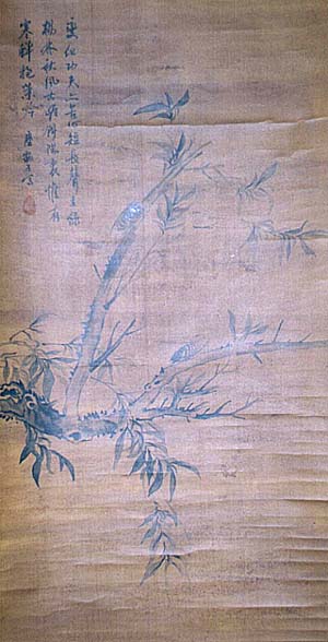 絹本肉筆・・縦92.5cm、横49cm 本品は、どこにも黄慎の名や落款が無いが、画 讃の末に「エイ(病の中の丙を櫻の右側に変え た字)瓢子・或いは座瓢子か」と書かれ、その下 に楕円の「硯耕」なる落款が押されている。「エイ 瓢子」も「硯耕」も共に黄慎の号であれば、結果 として黄慎の作となるのであるが、問題は、画も 字も現存の黄慎作品より、遙かに上手い点であ る。であれば、「硯耕」なる落款を押した座瓢子 なる人物の、倣黄慎作品と言うことになるであろ う。楊の枝の上に止まった二匹の寒蝉を描いた 図で、構図的には非常に面白い絵柄である。画 讃は「変化功夫亦苦心、短長聲在緑楊林、秋風 古岸斜陽裏、惟有寒蝉抱葉吟」の七絶であり、 落款は陰文の「硯耕」である。黄慎か否かは別と して、画自体はなかなかの作である。黄慎は、福 建省寧化の出身で、清初の康煕26年(1687) 〜乾隆33年(1768)の人、恭壽・恭懋・躬懋・ エイ瓢・エイ瓢子などと号し、人物・花卉・草書な どを得意としている。尚、黄慎は「揚州八怪」の 一人である。 |
