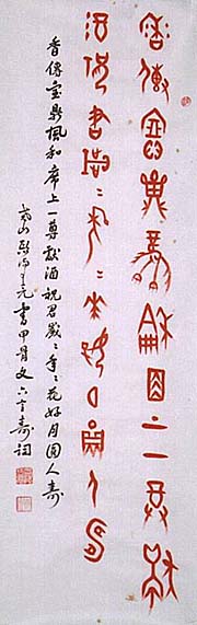 紙本肉筆・・縦70cm、横23cm 陰刻「歐陽可亮」と陽刻「堯山」の落款が押されている。 歐陽堯山は北京の人で、名は可亮、字は堯山、号を如 水と称し、初唐の書家歐陽詢の直系第44代の子孫であ り、甲骨文字の研究者にして書家で、戦後日本に在って の甲骨文書家の権威でもあり、彼は羅振玉・章式之・丁 輔之・董作賓ら諸氏が、甲骨文で書いた詩聯3319首を 所蔵されていた。また彼は、京都在住時に中国学者白川 静氏らと交流を重ね、後に東京の三鷹に住してからは、 拓殖大学や国際基督教大学などで教壇に立っている。 本品は、朱文で24字の甲骨文字が書かれている。 |