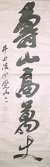 紙本肉筆・・縦131cm、横41cm 「井田法印磐山書」の下に、陰刻「餐霞之印」と陽刻 「法印磐山」の落款が押されている。井田磐山は因 幡の人で、本姓は本池氏、名は直、字は十旦、号を 磐山・餐霞翁などと称し、若くして書を好み書法を求 めて研鑽し、自から磐山流を創始して諸国を遊歴し 、奥州で書法教授に従事した後、京の比叡山に逗 留し門額などを揮毫し、その功に因り法印に補せら れ、苗字帯刀を許された書家にして儒者で、晩年は 郷里で活躍している。 |