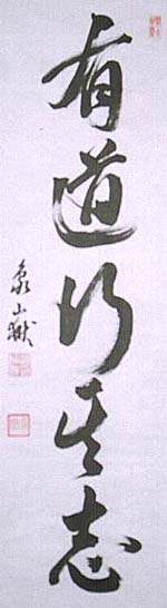 紙本肉筆・・縦127cm、横40cm 「象嶽」の下に、陰刻回印の「源頼壽印」と陽刻「 象嶽」の落款が押されている。松平象嶽は高松の 人で、名は頼寿、号を象嶽と称し、旧高松藩主松 平頼聡の八男で、貴族院議員として活躍し、第六 代貴族院議長を勤めた華族で伯爵であり、国風 盆栽会初代会長として、戦前・戦後の盆栽界に多 大な影響を与えている。尚、彼は、大東文化協会 第六代会頭にして、大東文化学院第八代総長で もある。 |