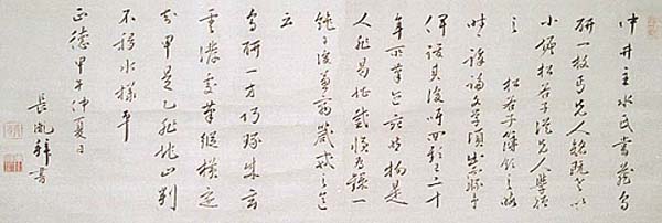紙本肉筆・・縦30cm、横74cm 「正徳甲午(四年・1714)仲夏日 長胤拜書」の横に、陽刻の「長胤」と陰刻の「東涯」の落款 が押されている。伊藤東涯は京の人で、名は長胤、字は原蔵・元造、号を東涯・慥慥斎などと 称し、京の大儒者伊藤仁斎の長子で、家学を受け継ぎ義古堂で講説に従事した儒者である。 本品は、「烏研小序併詩」と題された、黒色硯に関する小文と七絶詩が書かれているが、これ と同じ詩文が東涯の文集である、『紹述先生文集』卷二十八の七言絶句詩の所に、「烏硯詩」 と題して収められている。 |