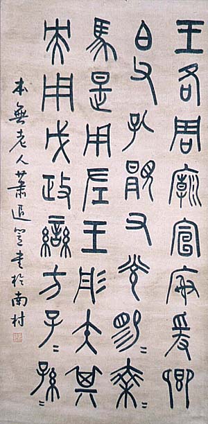 紙本肉筆・・縦129cm、横64cm 蕭蛻(同治三年〜民國四十七年)は浙江省の人 で、字は中孚・退闇、号を寒蝉・皐松などと称し、 書法・篆刻に優れた作家で、その門下にはケ散 木などがおり、また清末民初に於ける上海の文 学団体である南社の一員としても活躍している。 本品は、堂々たる大らかな篆書で、文末には、「 本無老人蕭退闇書於南村」の署名と、「蕭蛻印」 なる陰刻の落款が押されている。蕭蛻の作と伝 えてはいるが、本来の蕭蛻の筆勢からすれば、 やや線が弱いように感じられる。 |
