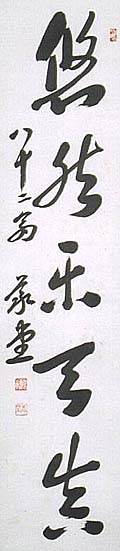 紙本肉筆・・縦106cm、横22cm 「八十二翁義堂」の下に、陰刻「竹田義蔵之章」と 陽刻「義堂」の落款が押されている。竹田義堂は 大阪の人で、名は義蔵、号を義堂と称し、吉富製 薬の社長や武田薬品の副社長を歴任した人であ るが、その祖先の由来は、天明元年(1781)に 大阪に薬種問屋近江屋を創業した、初代近江屋 長兵衛の実兄である七代竹田徳兵衛の次男が、 初代近江屋長三郎であり、その次男で大和の竹 田宗治郎家に引き取られていた伝次郎が、竹田 義蔵の父である。 |