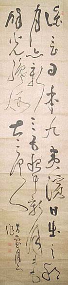 紙本肉筆・・縦106cm、横28cm 「方壺月下作」の下に、陰刻「邊禮之印」と陽刻「字伯高」 の落款が押されている。佐々木方壺は播磨の人で、名 は礼、別姓は渡辺氏、字は伯高・伯厚、号を方壺と称し、 菊池衡岳や亀井南冥らに学び、尾張藩の木曽代官で儒 者の山村蘇門に招かれ、武居敬斎らと郷校を創設し、自 らも木曽福島山村代官を務め、書に優れた儒者である が、同時に奇行の多さでも知られている。尚、文化十年 (1813)には山村蘇門と共に、漢詩文集の『忘形集』を 公刊している。 |