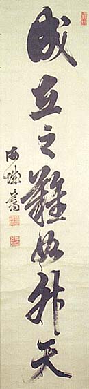 紙本肉筆・・縦129cm、横32.2cm 「海城書」の下に、陰刻「豊島海城」と「字曰五教」の落 款が押されている。豊島海城は尾張の人で、名は海 城、字は五教、号を名と同じ海城と称した書家・南画 家にして漢詩人で、明治9年に森春濤が編集した『東 京才人絶句』には、海城の七絶が三首採取されてお り、また明治13年(1880)に『題画自在』、明治21年 (1888)に『熱海温泉図絵』なる本を公刊しているが、 詳細は不明である。 |