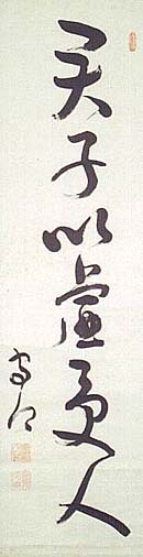 紙本肉筆・・縦123cm、横32.5cm 「光臣」の下に、陰刻「神尾光臣」と陽刻「號守卿」 の落款が押されている。神尾守卿は信濃の人で 、名は光臣、号を守卿と称し、諏訪藩士神尾平三 郎の次男で、明治7年に陸軍教導団に入って軍 人の道を進み、中国語に堪能で中国問題の専門 家として知られ、日清戦争では清国の降伏勧告 書の起草に参与し、東京衛戍総督・青島守備軍 司令官などを歴任し、陸軍大将となって男爵を授 けられ華族に列せられた軍人で、小説家の有島 武郎(二女安子の夫)の岳父でもある。 |