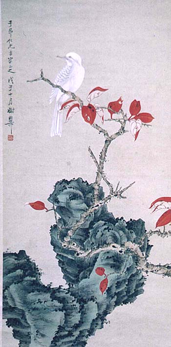 紙本肉筆・・縦95.5cm、横47cm 謝稚柳は江蘇省の人で、清末宣統二年(1910)に生ま れ、1997年まで生きた現代画家である。その室名を、 魚飲溪堂・煙江樓・苦篁齋などと号している。幼少から 画を学び、若い時は陳老蓮の画風に従い、晩年は李成 ・范寛などの画風に倣っている。本品は、岩の間から伸 びた紅葉を付けた一本の樹木に、白色の鳥が停まって いる構図で、端正な中に力強さを感じさせる凛とした風 情の絵柄である。「子昴仁兄方家正之、戊子(民國三十 七年・1948)十月、謝稚柳」なる署名の下に、陰刻の謝 稚柳の落款が押されている。 |