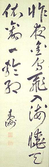 絹本肉筆・・縦130.5cm、横40.5cm 「青洲」の下に、陰刻「箕浦勝人」と陽刻「青洲」の落款 が押されている。箕浦青洲は豊後の人で、名は勝人、 号を青洲と称し、臼杵藩の武道師範実相寺常之丞の 次男で、九歳で藩校学古館に入って優秀な成績を収め 、十五歳で藩家老箕浦又生の養嗣となり、秋月橘門や 草場船山らに学び、更に上京して慶應義塾に入り、卒 業と共に報知新聞社に入社して民権運動の政論に健 筆を振るい、その後新聞社社長から大隈重信の改進 党に参加して政界に転じ、大臣や副議長などを歴任し た明治・大正期の民権運動家の政治家である。 |