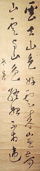 紙本肉筆・・縦136cm、横33cm 「孤峯」の下に、陰刻回印の「角貫次印」と陽刻「孤 峯」の落款が押されている。角田孤峯は山形の人 で、名は貫次、号を孤峯と称し、幼時から父に漢学 中学校等で教鞭を執るが、生来好んだ文芸方面に 進み、中国古典等を研究して『校訂講孟箚記』(昭 和8年・草古堂)・『葉隠抄』(昭和9年・竹処山房)・ 『国訳書論集成』(昭和12年・東学社)等を公刊した 書家にして漢学者である。 |