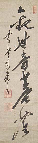 紙本肉筆・・縦67cm、横22.5cm 「黄檗木庵書」の下に、陰刻回印「釋性トウ印」と陽刻「木 アン(今+酉+皿)氏」の落款が押されている。木庵性トウ( 王扁の滔)は福建の人で、法名は性トウ、道号を木庵と称 し、19歳で仏門に入って隠元に法を問い、彼の招きで正 保二年(1645)に来日し、寛文四年(1664)に隠元の 後を嗣いで、宇治黄檗宗万福寺の第二代座主となった 品は、京都の旧家に伝わっていた品である。 |