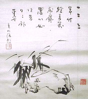 君川大島徳太郎、竹石圖併行草書五絶讃(近代、AD1862〜1943)