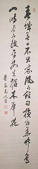 絹本肉筆・・縦136cm、横34cm 「學齋老人」の下に、陽刻「林昇字平仲」と陰刻「 別號學齋」の落款が押されている。林學齋は江戸 の人で、名は昇、字は平仲、号を学斎と称し、林 復斎の子で林家の家学を継承して、第十二代目 の大学頭となって寺社奉行などを務め、維新後は 群馬県師範学校教諭や日光東照宮禰宜などを歴 任し、詩文を善くした儒者である。 林家は大学頭を代々継承し、初代大学頭は羅山 ・二代鵞峰・三代鳳岡・四代榴岡・五代鳳谷・六代 代壮軒(檉宇の弟)・十一代復斎(壮軒の弟)・十 二代学斎へと、繋がって行く。 |