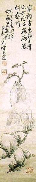 紙本肉筆・・縦107cm、横21.5cm 「白龍山人菅元道」の下に、陰刻「菅原元道」と陽刻「白龍」の落款が 押されている。菅原白龍は山形の人で、名は元道、号を白龍・梵林・ 泰岳などと称し、代々の修験者の家に生まれ、白龍山梵林院の祠官 となるが、長沼月峯や富取芳斎らに就いて花鳥画を学び、更に上京し て奥原晴湖の知遇を得て山水画を善くし、日本的な南画の確立に努 力した南画家である。尚、本品に使用されている印象三個は、全て彼 の代表的印象であるが、残念なことに全て微妙に刻線が異なり、且つ 贊文の文字はやや上手すぎ、逆に絵はそこそこで、全てが微妙に異 なれば、所謂「伝」の作品である。 |