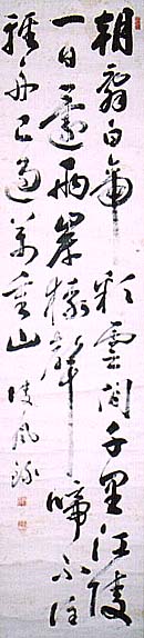 紙本肉筆・・縦146cm、横32.5cm 「陵風録」の下に、陰刻「長義」と陽刻「陵風」の落 款が押されている。石田凌風は京都の人で、名 は長義、号を凌風・陵風などと称した書家である が、詳細は不明である。ただ明治40年代に『小 学校に於ける最新図案教授法』なる本を出版して おり、また昭和21年に京都で東洋美術の振興を 目的に文人連盟創立の話が持ち上がった時に、 その協議に参加した各界の宿老達の仲に、その 名が見られる。因みに参加者は、中野越南・園田 湖城・原徂山・日比野五鳳・石田凌風・谷辺橘南・ 木村陽山・大橋廉堂・綾村坦園・秋山公道・竹内 香邨・田能村直外・森田緑山・川奈部尚石らであ る。 |