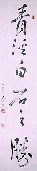 紙本肉筆・・縦133cm、横32.5cm 「川喜田久太夫」の下に陰刻「???印」と陽刻「水? 」の落款が押されている。川喜田半泥子は伊勢の人で 、名は政令、号を半泥子・莫加野盧・鳴穂堂・泥仏堂・ 反古大尽・其飯などとと称し、略200年以上15代続い た伊勢の豪商の子で、僅か一才で15代当主の祖父と 父を相次いで失い、第16代川喜田久太夫の家督を相 続し、百五銀行頭取などを歴任した財界人であるが、 書画・茶の湯・俳句など多彩な趣味を持った文化人で もあり、特に陶芸に関しては、趣味の域を超えた高い 評価を得ている。 |