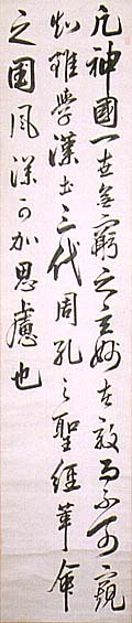 紙本肉筆・・縦125.5cm、横26.8cm 田中恭堂は豊岡の人で、名は綏猷、通称は河内介、 号を恭堂・臥龍窟などと称し、小森正造の次男である が田中綏長の養子となり、山本亡羊や摩島松南に学 び、尊皇攘夷の公卿中山忠能の諸大夫を務め、憂国 の志士と交わり、伏見寺田屋事件に関わって捕らえら れ、薩摩に送られる途上の船中で斬殺された、勤王の 儒者である。尚、本品は双幅の右一幅であるため、落 款も印象も無い。 |