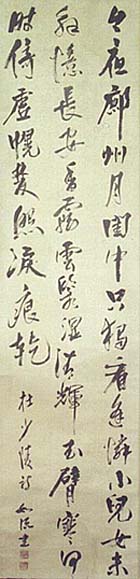紙本肉筆・・縦164cm、横40cm 「如流書」の下に、陰刻「松井郁印」と陽刻「如流」の落 款が押されている。松井如流は秋田の人で、名は郁次 郎、号を如流と称し、吉田苞竹に師事した書家で、日展 理事などを歴任した元・大東文化大学教授である。本 品は、松井氏とは似ても似つかない贋品で、紙質・装丁 等から言えば、恐らく中国で作られた品であろう。この 20年来中国で近現代日本書作家の贋物が作られ、そ れが多量に日本に持ち込まれているが、本品もその中 の一本である。 |