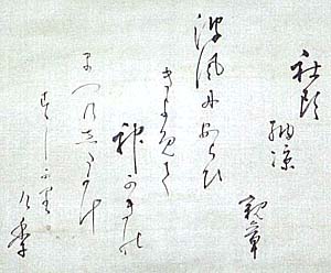 紙本肉筆・・縦30cm、横35cm 「親章」の署名が有る。高崎親章は薩摩の人で、 国学・和歌を八田知紀に学び、郷里に学舎を開 いて子弟を教育した国学者高崎親広の長男で、 内務省警視庁に入庁し、大警視川路利良の密 命を受け、下野中の西郷隆盛の動勢視察の為 に帰郷し、西郷の私学校から武器弾薬を勝手に 持ち出して捕らえられ、西南戦争の引き金役と 成り、戦争後に救出されると、茨城・長野・岡山 等の知事を歴任した、官僚政治家である。 |