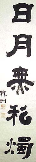 紙本肉筆・・縦129.5cm、横30.5cm 「無劍」の下に、陰刻「渡邊千冬」と陽刻「無劍逸 侠」の落款が押されている。渡邊無劍は長野の人 で、名は千冬、号を無剣と称し、日本製鉄所・日 仏銀行等の取締役を務めた後、政界に転じて濱 口・若槻の各内閣で法務大臣を務めた人で、子 爵の実業家にして政治家であるが、能書家として も知る人ぞ知る人物で、将棋の駒の字母を揮毫 しており、明治から大正にかけて活躍した駒師の 初代豊島龍山が残した「字母長帖」には、「前司 法大臣渡邊千冬 号無劍」と記載されており、そ れに因れば、表は隷書で裏は篆書のコラボレー ションで、特に歩の「と金」の篆書が独特である。 |