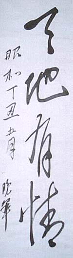 紙本肉筆・・縦110cm、横30cm 「昭和丁丑(12年)五月」の下に、「晩翠」の署名が 有る。土井晩翠は仙台の人で、名は林吉、号を晩翠 と称し、詩人にして英文学者で、漢詩調詩風で一世 を風靡し、第一詩集の『天地有情』は有名である。明 治期は、「星落秋風五丈原」や「荒城の月」等詩人と して活躍し、大正期は『チャイルド・ハロウドの巡礼』 の翻訳等、英文学者としての活躍が見られ、1950 年には詩人としては初の文化勲章を受章している。 |