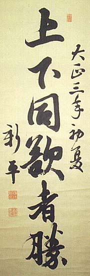紙本肉筆・・縦143.2cm、横47.1cm 「新平」の下に、陰刻「後藤新平」と陽刻「無隠書 樓主人」の落款が押されている。後藤新平は陸奥 の人で、名は新平、号を無隠と称し、幼にして武 下節山に漢学を学び、次いで藩校立生館で経史 と詩文を修め、18才で須賀川医学校に入り、各 地の病院で医師を務めた後に内務省の衛生局に 転じ、その後政界に入って台湾総督府民政長官・ 満鉄初代総裁・内務大臣・外務大臣・東京市長・ NHK初代総裁・拓殖大学第三代学長等を歴任し た、医師にして官僚で政治家である。台湾の近代 化に於ける彼の足跡は、特筆すべきものが有る。 |