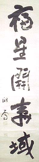 紙本肉筆・・縦130cm、横33cm 「關雪」の下に、陰刻「橋氏士道」と陽刻「關雪」の 落款が押されている。橋本關雪は神戸の人で、 名は関一、字は士道、号を関雪と称し、明石藩の 儒者橋本海関の長男で、幼時より漢学を父から 受け、画を竹内栖鳳に学び、帝展審査員・帝室技 芸員・帝国美術院会員等を歴任した日本画家で、 生涯に30回以上中国に遊歴して中国古典に精 通し、古美術研究家としても知られている。 |