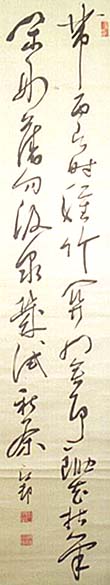 紙本肉筆・・縦137cm、横29cm 「江邨」の下に、陰刻「田口文之」と「文臧別號江邨」の落款 が押されている。石合江邨は備前の人で、名は文之、字は 文藏、号を江邨と称し、初めは田口氏であったが後に石合 氏に改め、江戸に出て古畑玉函に師事し、経学に精通して 詩を善くし、館林藩主の賓師に召されて幕府の諮問にも応 じ、甚だ尊重された儒者である。本品は「田口文之」の印象 が使われていれば、改姓以前に書かれたものである。 |