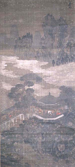 絹本肉筆・・縦120cm、横51cm 文徴明は、江蘇の人で、字を徴仲、号を衡山・停 雲生などと称し、成化六年(1470)から嘉靖三 十八年(1559)に生きた書画家で、画は山水・ 花卉を、書は楷書・行書を得意とした、明代を代 表する四大画家(沈周・文徴明・唐寅・仇英)の 一人で、同時に呉中の四才子(祝枝山・文徴明・ 唐寅・徐禎卿)の一人でもある。本品は、右上に 行書で「徴明」の署名が有り、その下に陰刻回印 の「文徴明印」と、同じく陰刻の「雁門世家」の落 款が押されているが、経年的な痛みや滲み及び 顔料の剥離状況等から、古渡り品と言えるが、 装幀は明治期の改装で和様仏式軸装である。 因って倣品とは雖も、可成り古い(明末清初頃か 或いはそれ以前)時期の写しと推測される。 |