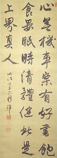 絹本肉筆・・縦136.6cm、横18.7cm 「明治壬午(15年)六月準」の下に、陰刻「利準 之章」と陽刻「戊辰徴士」の落款が押されてい る。小崎利準は伊勢の人で、名は利準、字は 公平、号を我我・我々陳人などと称し、業を藤 森天山の門に学び、明治元年に美濃笠松県判 事に着任後、5年から19年まで岐阜県令を、1 9年から26年まで岐阜県知事(第3代)を務め 、明治初期の岐阜県政に大きな足跡を残した 政治家であるが、同時に幕末の儒者角田錦江 遊を重ねた漢詩人としても名高く、岐阜県発行 『華山新誌(明治15・16年)』には、当時の岐 阜県下の漢詩壇を構成した人々として、水谷奥 らが記載されている。 |